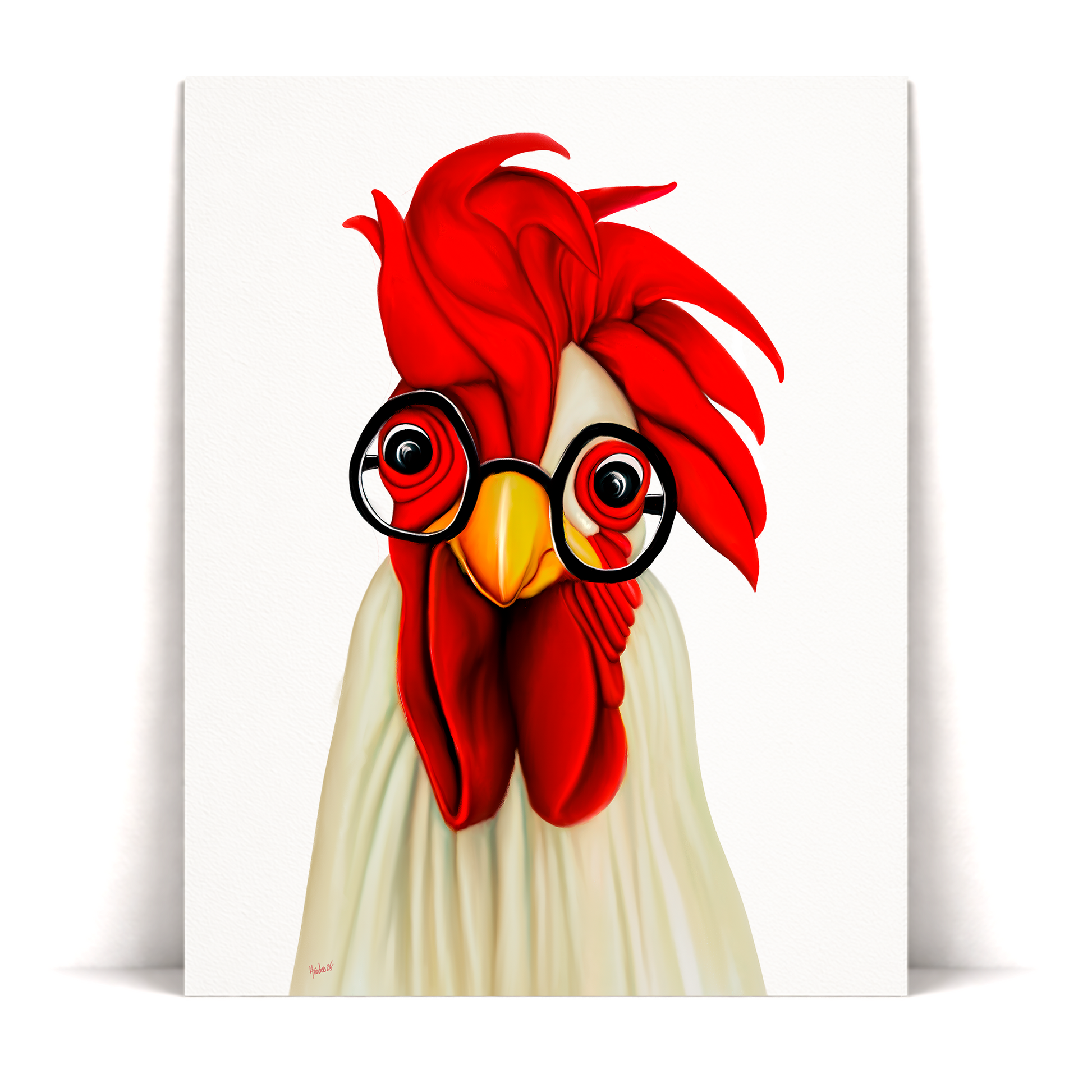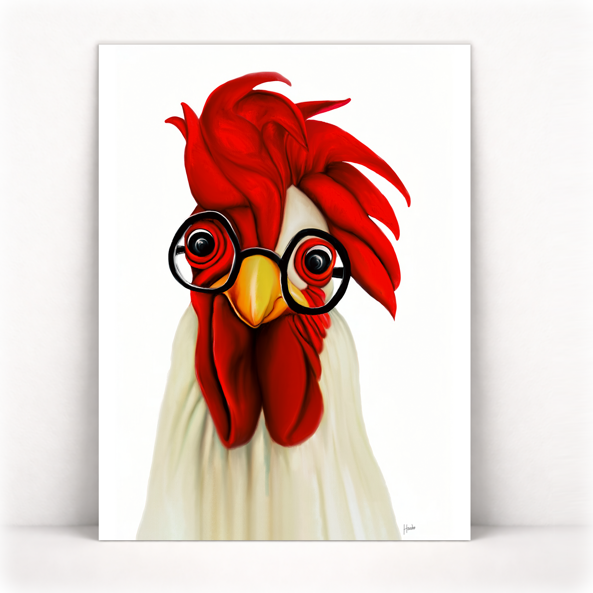 "Clarence", the smartest rooster in the gallery was inspired by my mother's spirited rooster, "Rodney", and her love of reading. Clarence and his black readers honors those memories —a feathered friend with a story to tell.